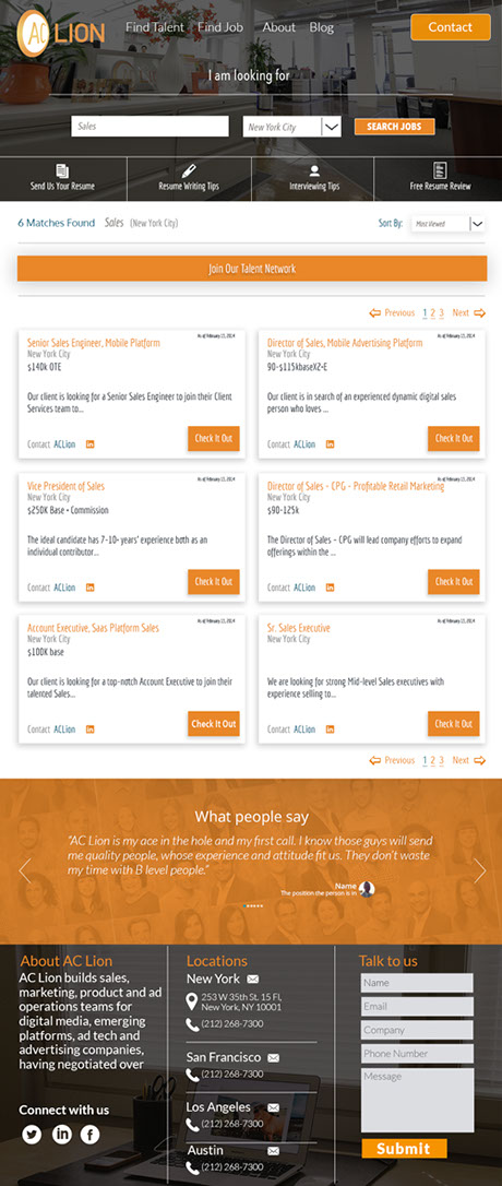 As a design consultant for Appsolute Media, I created an experience for AC Lion, a leading executive job search firm. We developed an experience that makes it simple for the user to enter a search and display the listings in an easy-to-follow card format. I also worked on web design and office space photography.